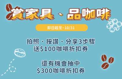 來CAMA豐原北陽店體驗家具,”按讚+拍照+分享” 就能獲得$100咖啡折扣券,還有機會抽中咖啡折扣券$300!