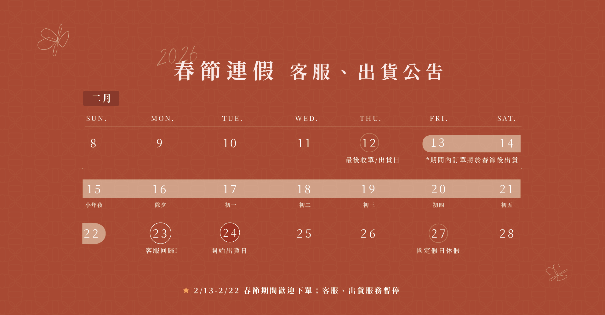 ▸2/13(五)-2/22(日) 期間客服、出貨服務暫停。