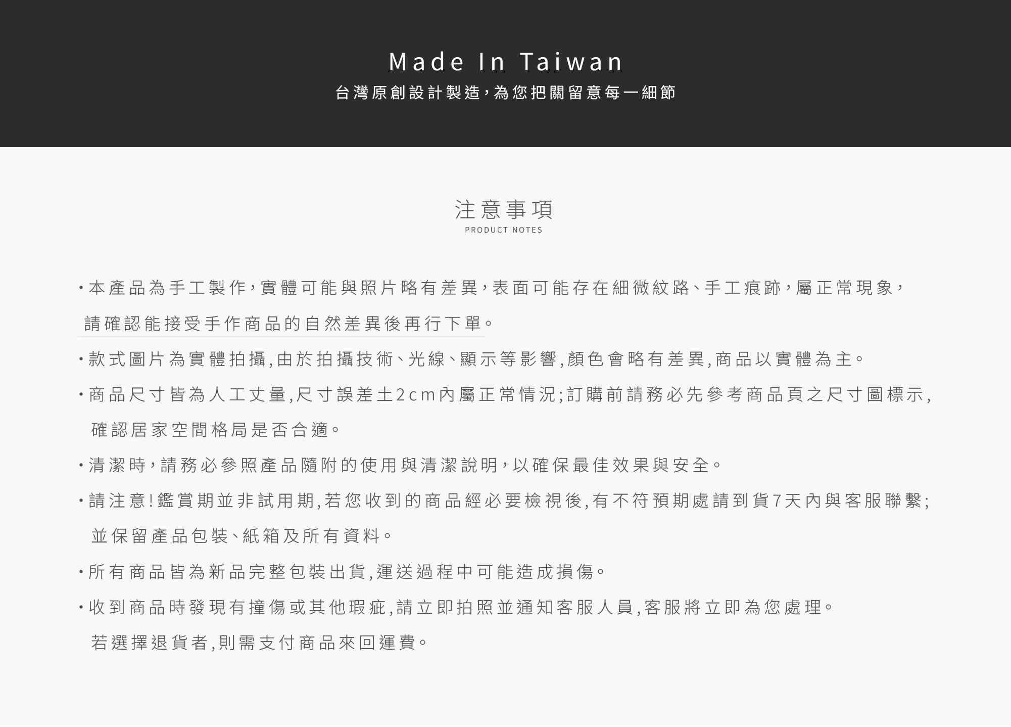 .商品送達後,請即時確認商品內容與外觀,若發現瑕疵,我們將安排重新配送同款商品。