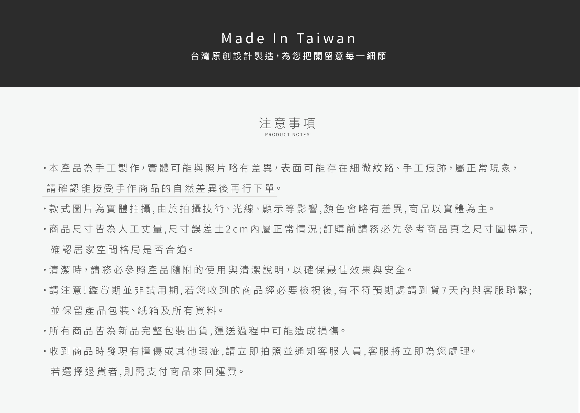 .商品送達後,請即時確認商品內容與外觀,若發現瑕疵,我們將安排重新配送同款商品。