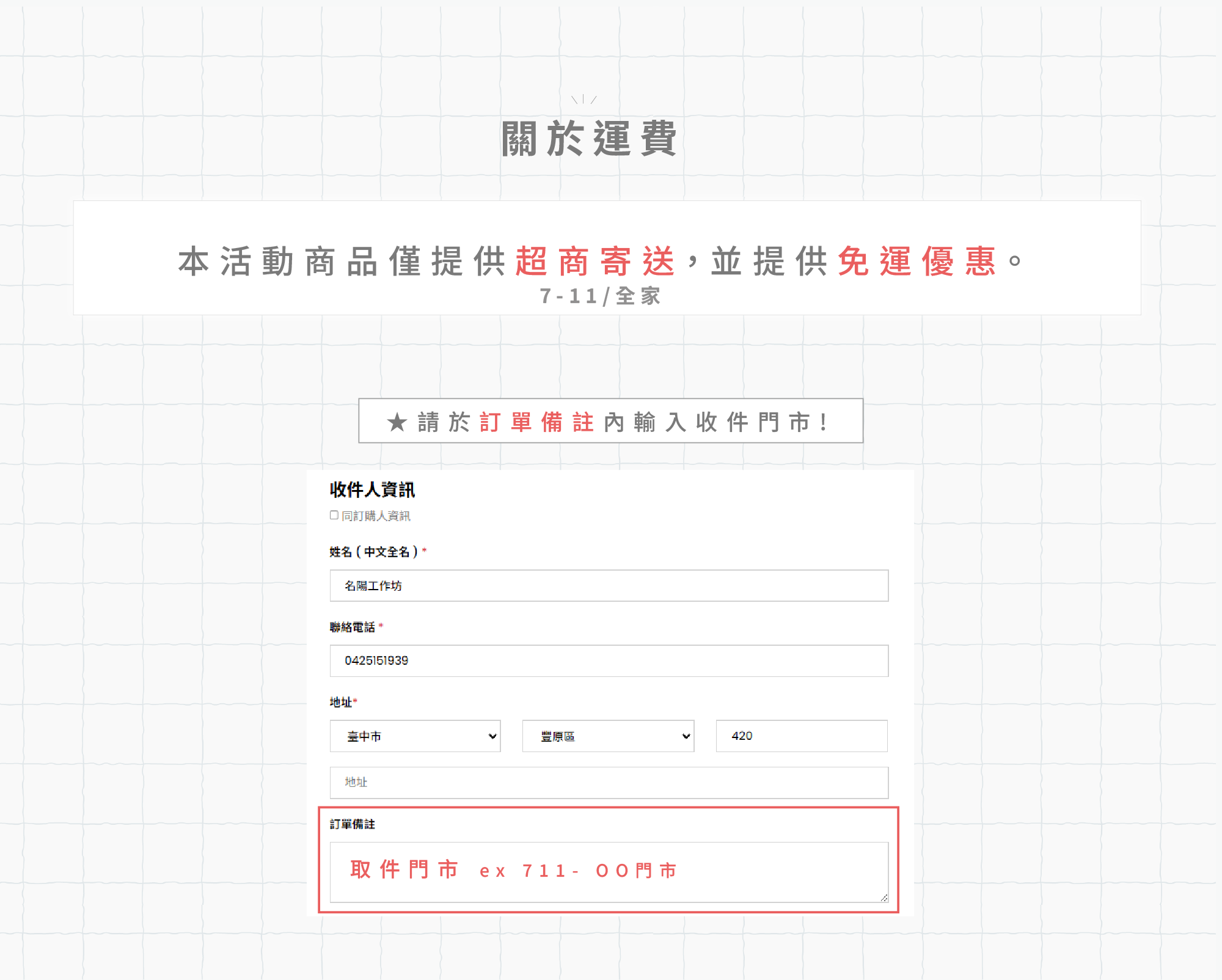→ 結帳時請在備註欄填寫門市(711 / 全家)