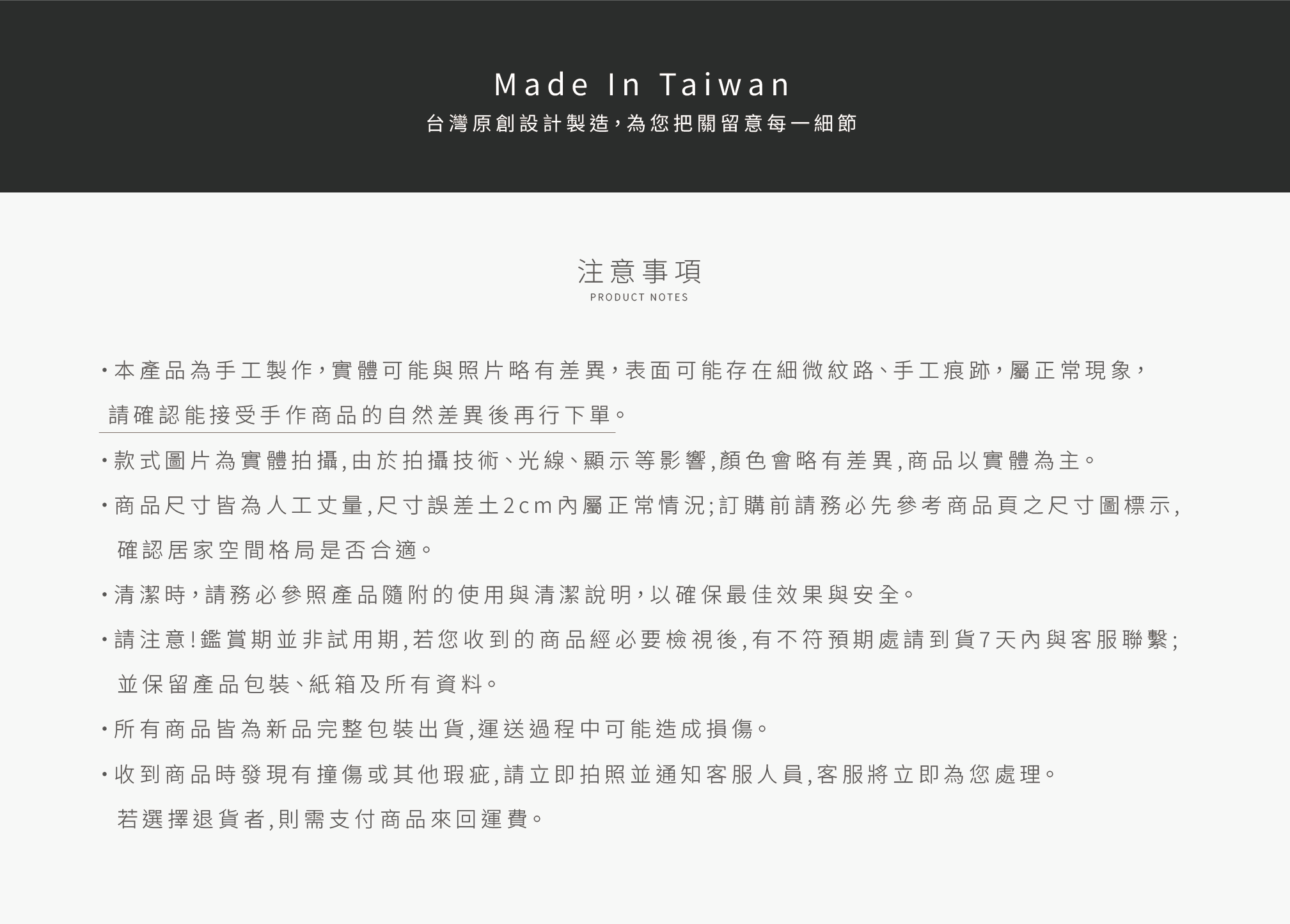 .商品送達後,請即時確認商品內容與外觀,若發現瑕疵,我們將安排重新配送同款商品。