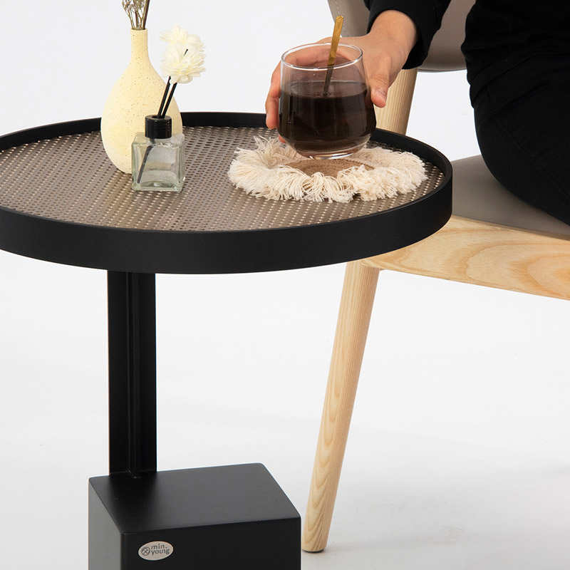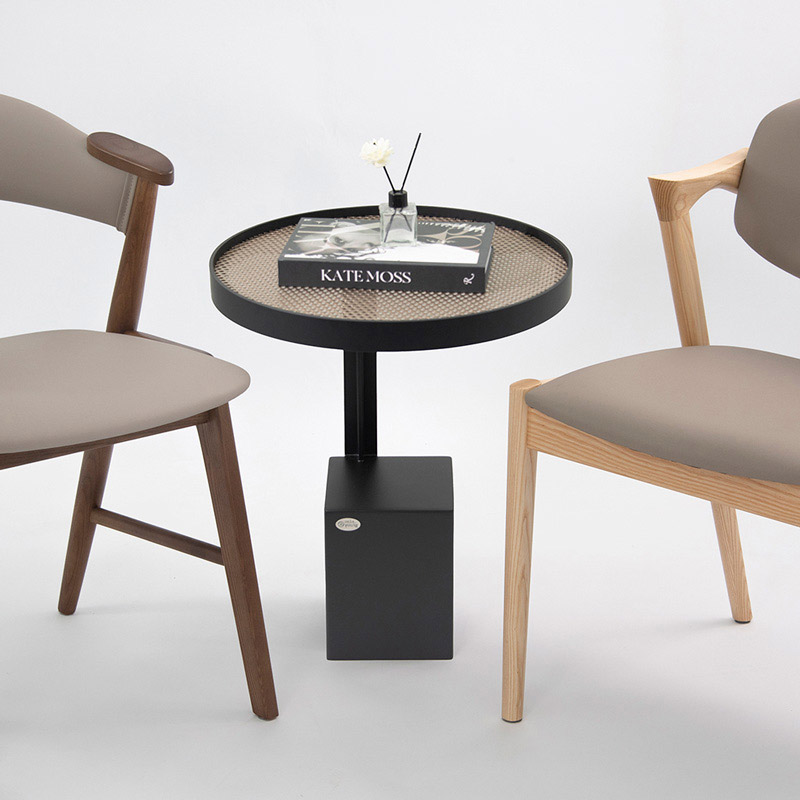 - 桌面以整齊排列的洞洞挖空,營造視覺輕盈感。