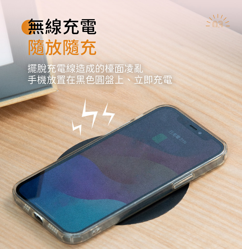 - 無線充電,隨放隨充,擺脫充電線造成的檯面凌亂。