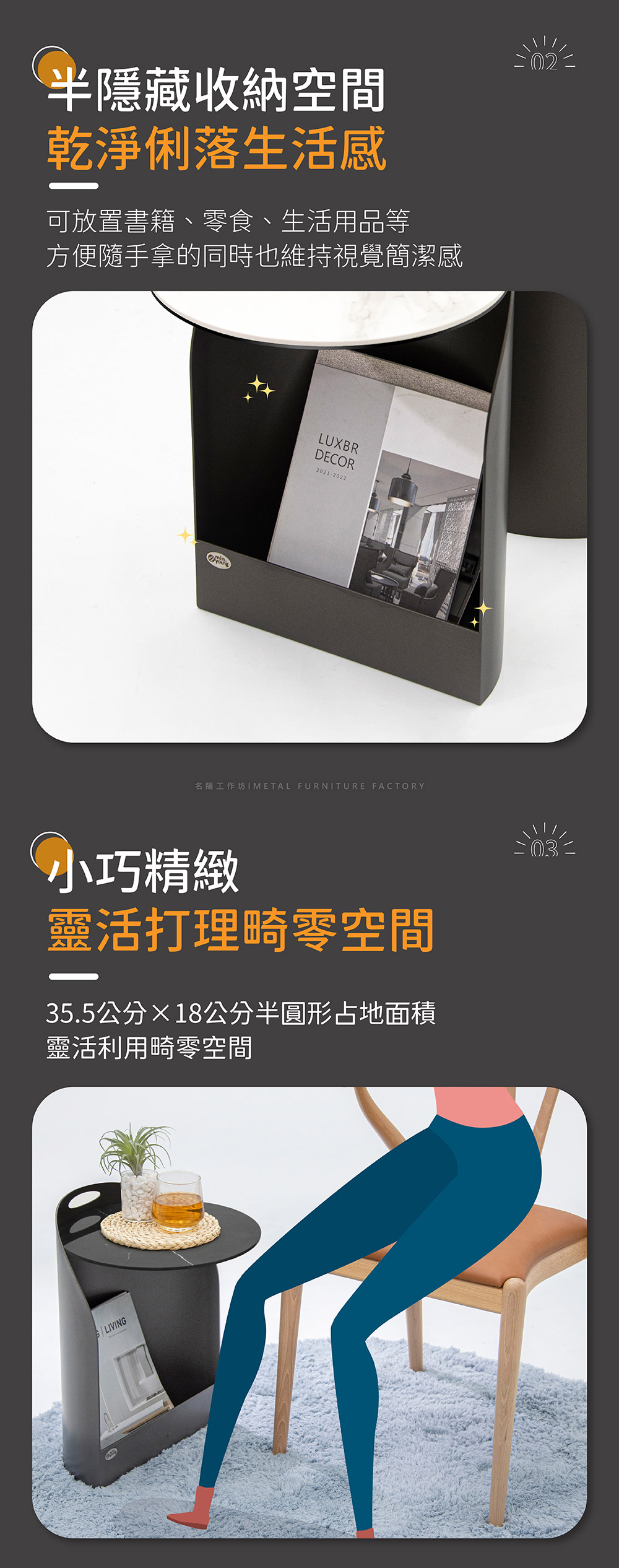 - 半隱藏收納空間,可放置書籍、零食、生活用品等,方便隨手拿的同時也維持視覺簡潔感