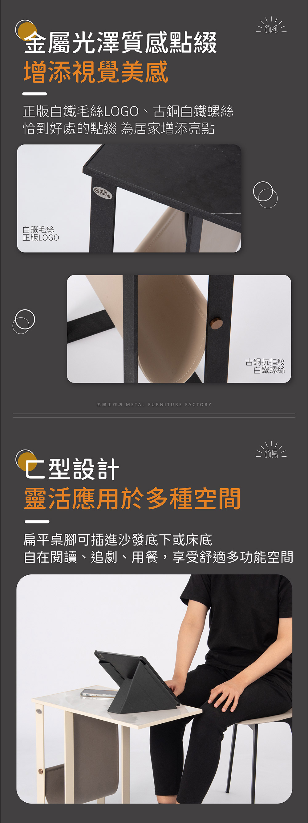- ㄈ型桌腳設計,靈活應用於多種空間,可插進沙發底下或床底,自在閱讀、追劇、用餐。
