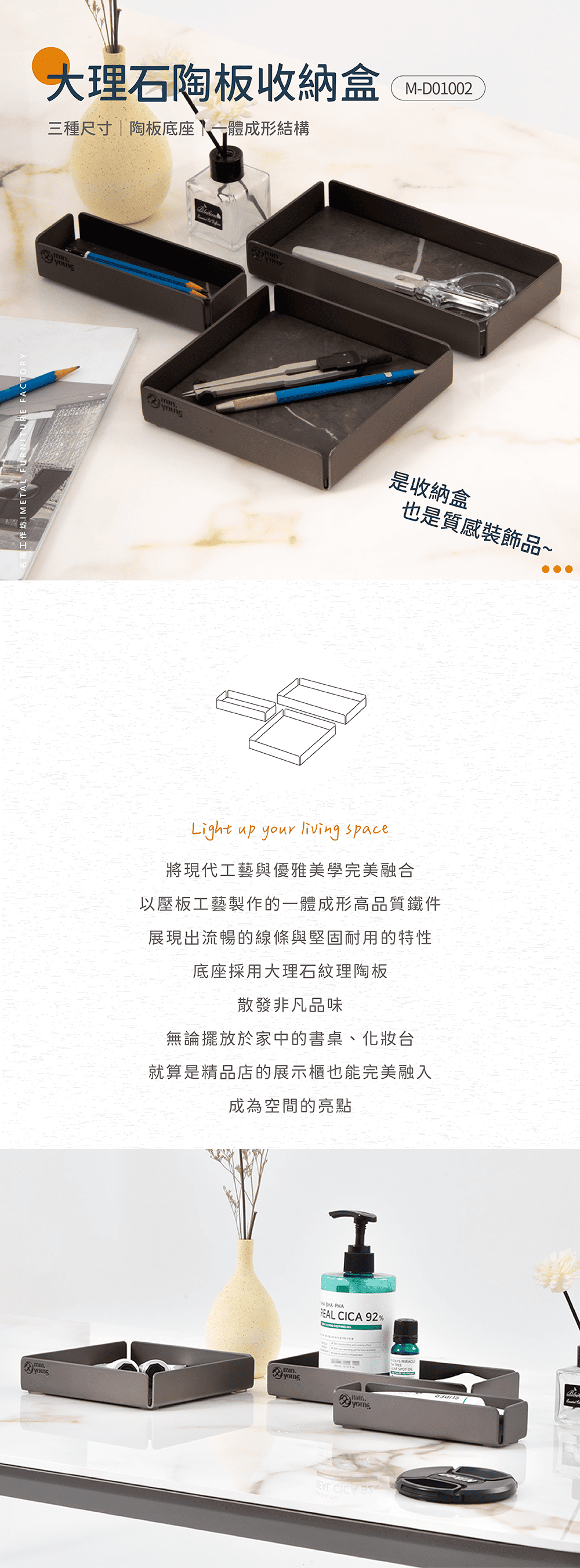 - 收納文具、化妝品,或是其他小物件,皆為空間增添整潔感與時尚感。