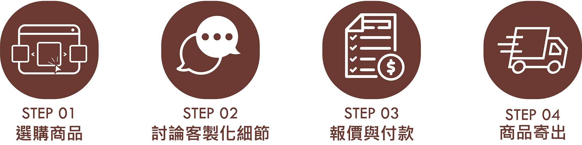 - 收到款項後,即安排現場製作。製作工期約 3 ~ 4 周,若有希望交期,可向專員提出。